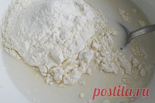 3. Добавить 1 ч. л. разрыхлителя и муки столько, чтобы получилось тесто, как на оладьи.