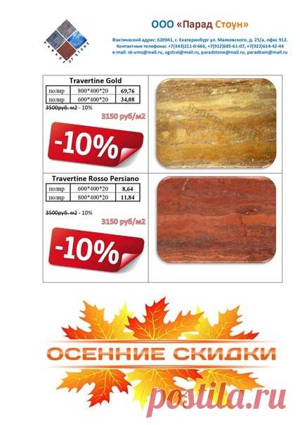 ЛИКВИДАЦИЯ СКЛАДСКИХ ОСТАТКОВ ТРАВЕНТИНА СКИДКА 10% Успевайте! 8 912 685 61 07 / sk-ums@mail.ru 8 912 241 92 44 / paradstone@mail.ru 8 982 709 82 70 / ugstroi@mail.ru Наш офис: г. Екатеринбург, ул. Маяковского 25а, офис 912