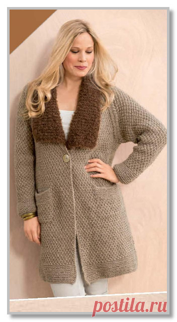 Вязание спицами. Пальто-реглан с V-вырезом и меховым воротником. Большие размеры: 42/44 (48/50) 54/56