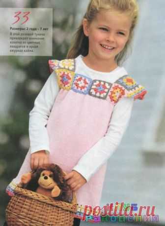Детская туника с цветными квадратами - Клуб рукоделия Размеры: 2 года — 7 лет В этой розовой тунике привлекают внимание кокетка из цветных квадратов и яркая ажурная кайма. Размеры готового изделия: окружность талии…