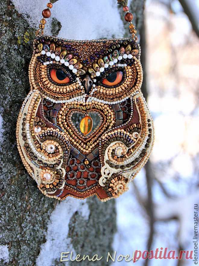 Купить Совушка и зима Коричневая Сова вышитая бисером с янтарем - сова, вышитая сова, совушка