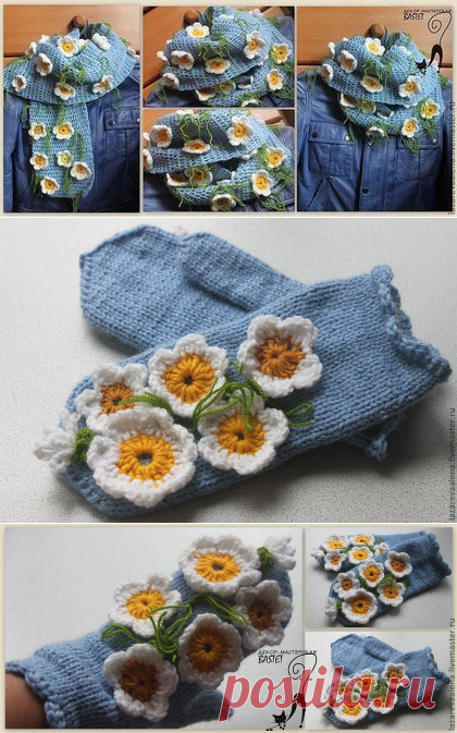 Купить АКЦИЯ !!! 1500 руб шарф!ДИЗАЙНЕРСКИЙ ШАРФ "РОМАШКИ" - голубой, цветочный, шарф, варежки