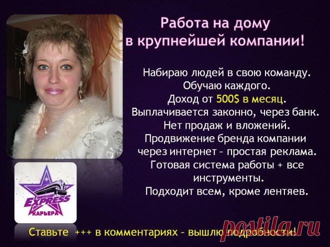 Условия: свободный график, занятость 2 – 3 часа в день, надомная работа, все необходимое для работы и обучения предоставляется.