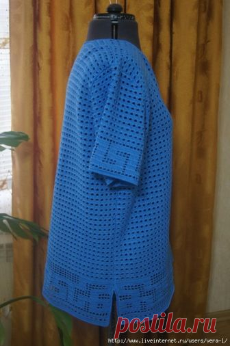 Простая кофточка регланом сверху, Взяла узор ленивые медвежьи лапки - там узор вяжется только в лицевых рядах, а в изнаночных - просто по рисунку петли провязываются. Регланная линия - кусочек мережки из того же узора, прибавки - накиды, кофточка-то летняя, пусть будет побольше дырочек ) Рукавчик короткий, туда тоже кусочек узора, а уже весь пустила по низу кофточки.