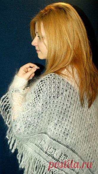 Шаль связана по классической схеме- плотная середина и ажурная кайма.Серая пуховая шаль неприхотлива в использовании,потому она долгие годы не теряет своего вида, со временем становится более пушистой!
