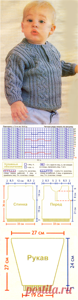 Схема вязания спицами, свитер с косами на мальчика 2-3 года.