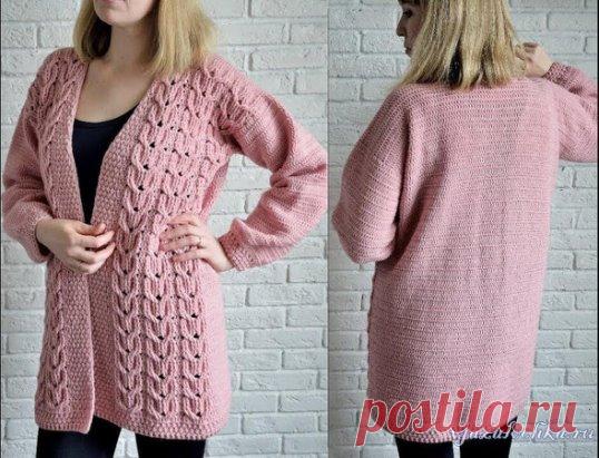 Длинный, как будто сотканный кардиган производит необыкновенное впечатление! Кроме того, он крайне удобен благодаря свободному фасону, капюшону и большим карманам.