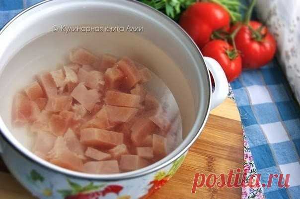 Куриную грудку порезать на кусочки, залить водой, пос...