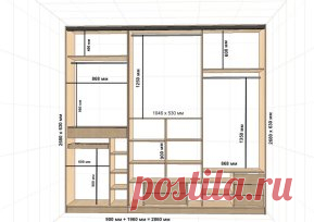 1. Продумываем чертёж шкафа - габариты шкафа-купе, сколько секций в шкафу, количество полок, нужны корзины или ящики, где будет штанга...