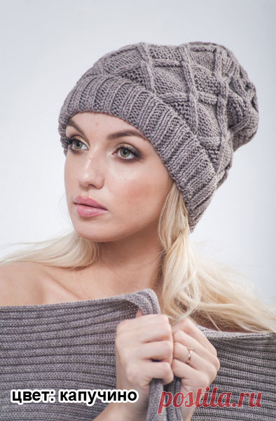 Шапка с помпоном "Романтическое настроение" вязаная спицами Зимняя мода 2014-2015 уделяет повышенное внимание вязаным головным уборам. Всякие шапки-береты, оказывается, сейчас весьма востребованы, особенно с крупной рельефной вязкой. Приветствуются все ухищрения, которые увеличивают объём изделия, в том числе косы, жгуты и подобные крупные узоры.