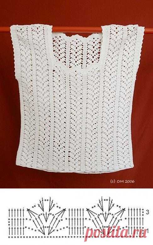 Сегодня представляю вашему вниманию летние майки, топы, кофточки, кому как нравится. Этот топ связан из вискозного шёлка (Камтекс), крючком № 3. Схема кокетки Схема основного узора