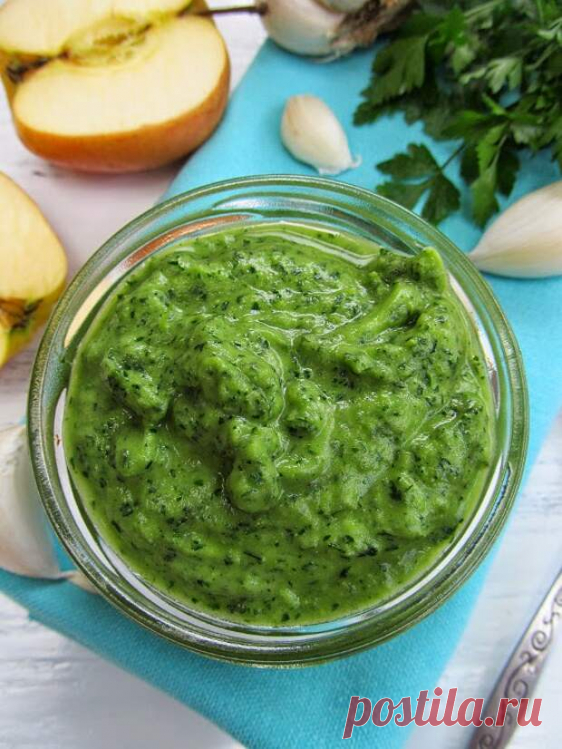 Соус из петрушки, чеснока и яблока Этот соус просто потрясающий! Очень вкусный!!! Вкус немного островатый, свежий, не резкий, структура нежная. А еще он безумно ароматный!!!! А какой у него потрясающий изумрудный цвет!!!! Прелесть!!! Т…