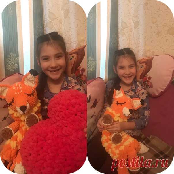 Танюшка, это чудо!!! Ребёнок счастлив!!! Она назвала лисёнка Лина (у нас лисёнок-девочка). Лисичка невероятно мягкая, плюшевая, без твёрдых деталей-её не хочется выпускать из рук:))) А ещё она функциональная-мы теперь аккуратно складываем пижаму и она хранится у Лины до вечера:) Спасибо!!!
