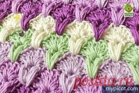 2 ряд — (зел. нить) 3 возд п. для подъема 2 ст. с нак. * (кр. нить)4 ст. с двумя нак., (зел). 3 ст. с нак.* (все нити проводить перед вязанием.