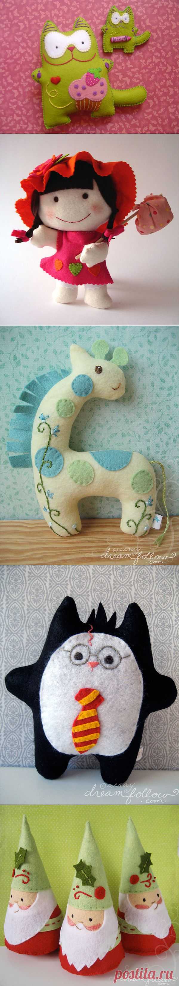 Забавные игрушки из фетра по одной выкройке.