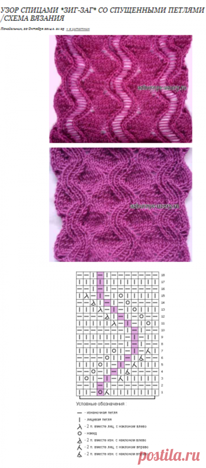 Узор cпицами *Зиг-заг* со спущенными петлями /схема вязания
