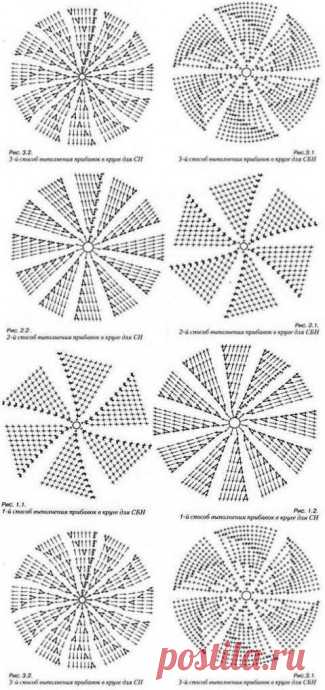 Законы плоского круга 1 закон. Если круг вяжут ст. б/н (столбиками без накида), то начинают в 1-м р. с 6-ти ст. б/н, делят круг на 6 клиньев и прибавляют в каждом ряду-кругу по 6 столбиков.2 закон. Если круг вяжут п/ст. (полустолбиками), то начинают в 1-м р. с 8-ми п/ст., делят круг на 8 клиньев и делают 8...