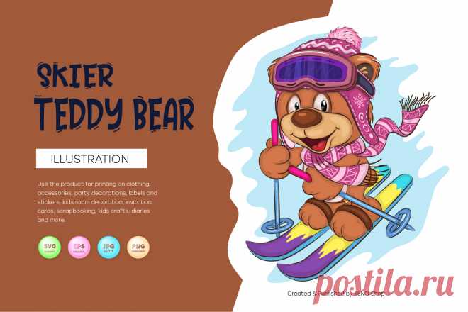 A cute illustration of a cartoon Teddy Bear riding a ski. Unique design, Children's illustration. Use the product for printing on clothing, accessories, party decorations, labels and stickers, kids room decoration, invitation cards, scrapbooking, kids crafts, diaries and more.