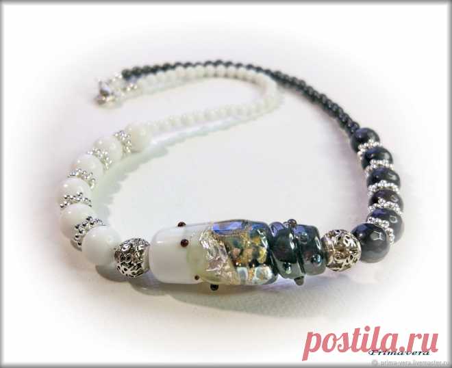Ожерелье выполнено из бусин желто-зеленого агата-кракле (крабовый агат). Бусины очень красивые. Центральный элемент - бусина ручной работы (lampwork) в той же цветовой гамме, стилизованная бабочка.