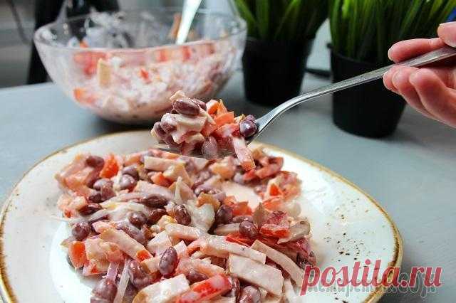 Салат из ветчины и фасоли Яркий, красочный салат из фасоли с ветчиной украсит любой стол. Сытный и очень простой, ничего варить не нужно. Очень выручит хозяйку, когда гости на пороге и прекрасно дополнит любой праздничный (нов...