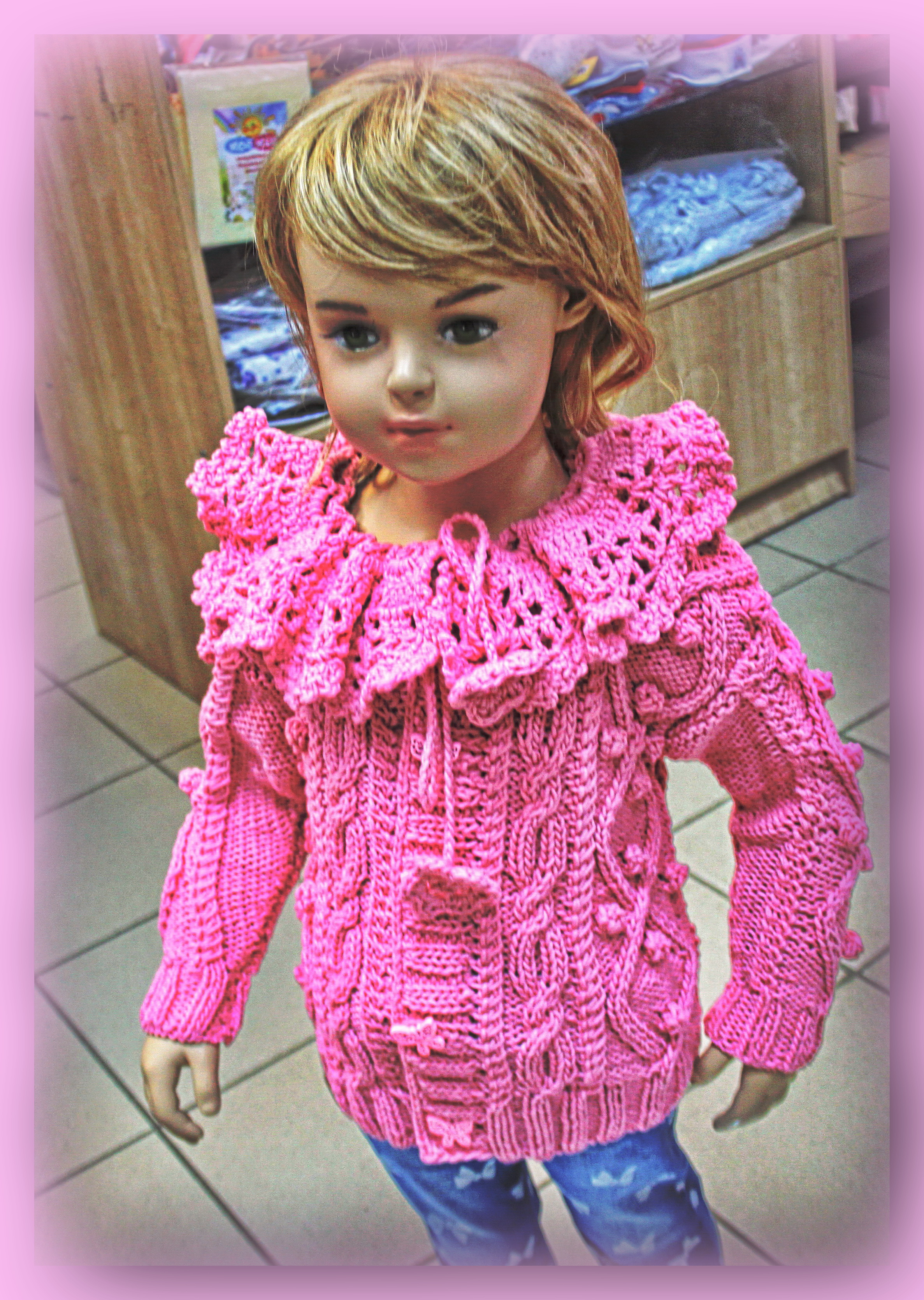Джемпер связан для девочки 92 см в стиле аранского вязания. Рельефные косы и сложные переплетения невольно приковывают взгляд.. Рельефные рисунки идут спереди, по спинке и рукавам модели. Яркая, индивидуальная разработка модели, надеюсь, приведет в восторг немало ценителей прекрасного.