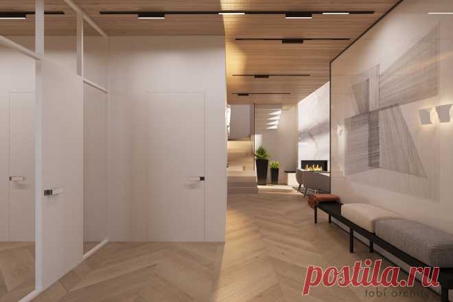 Теплый просторный интерьер нашего Modern House. Интерьер дома зачастую отличается от интерьера квартирного: в нем больше воздуха, пространство сложнее, экстерьер вступает во взаимосвязь с внутренним наполнением и влияет на него. За этим домом раскидывается шикарная панорама на овраг, которая просматривается через огромные витражные окна. Второй этаж объединен с гостиной двусветным пространством, таким образом идя к спальням, мы продолжаем видеть красивый вид из окон.