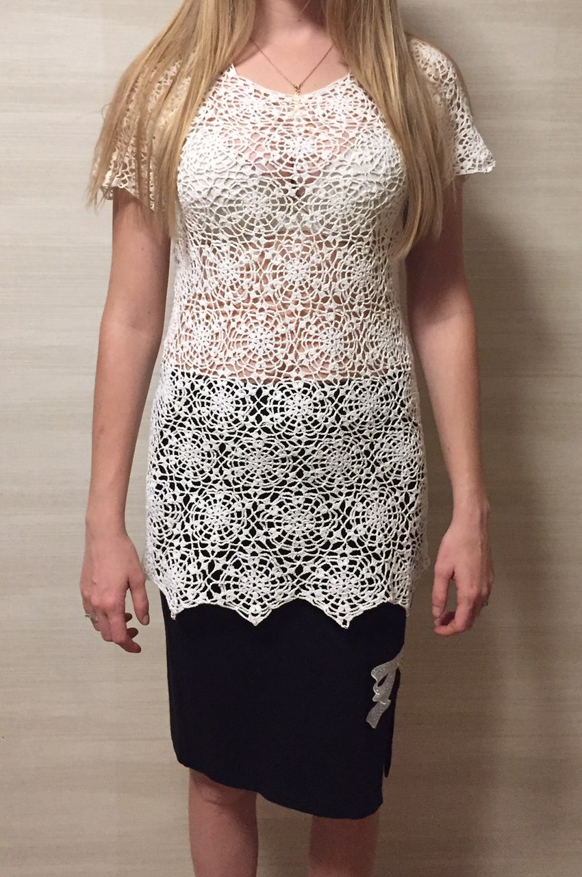Вязаная крючком ,универсальная вещь.46р. Можно носить с майкой,водолазкой,топ-бра и на пляж. Тонкое кружево крючком из хлопковой нити.Вещь не капризная,износостойкая,пластичная. Есть в наличии и свяжу на заказ,перешлю почтой.