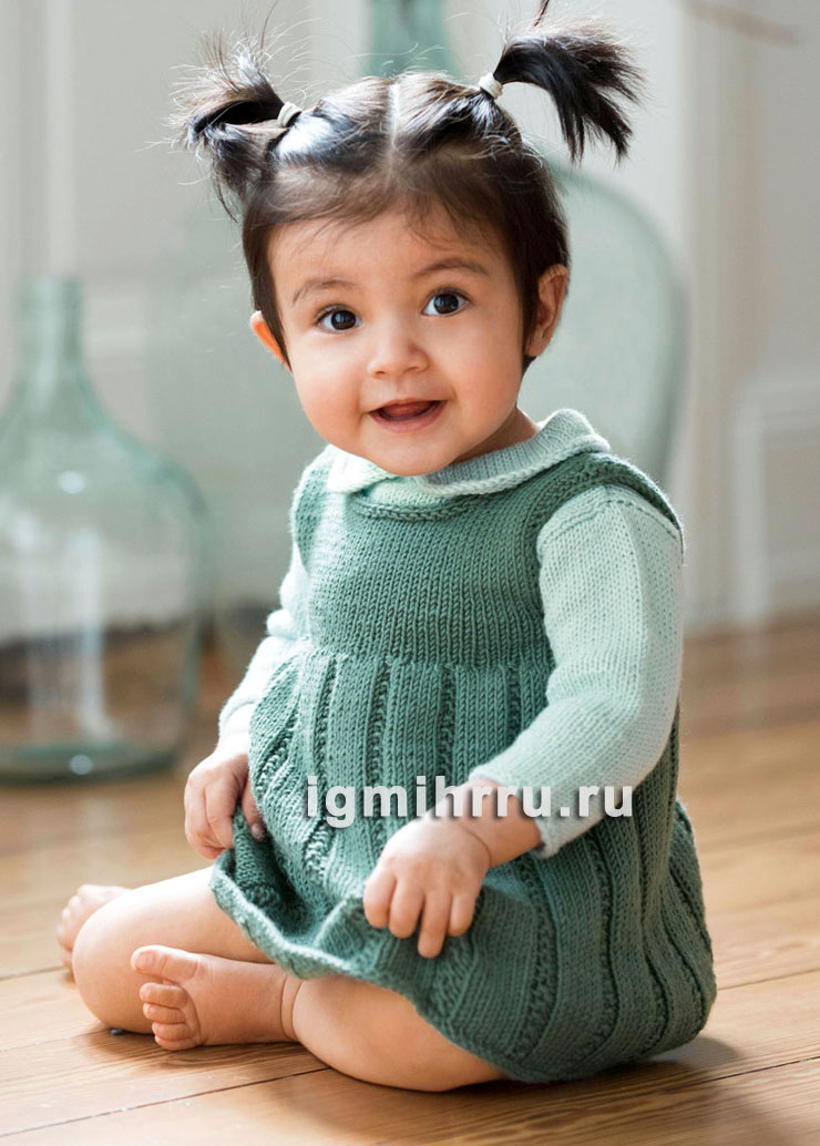 Темно-зеленый теплый сарафан для маленькой девочки. Вязание спицами для детей