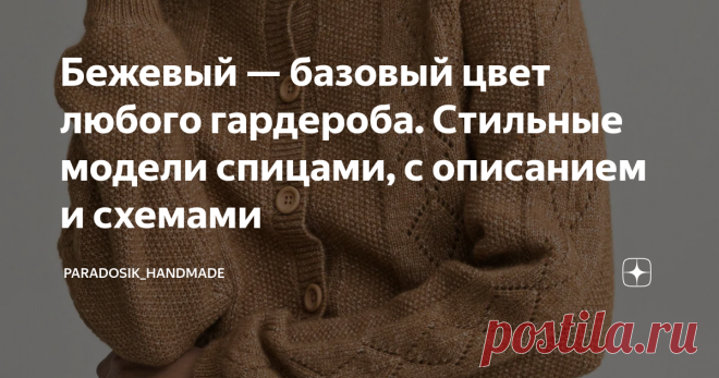 Бежевый — базовый цвет любого гардероба. Стильные модели спицами, с описанием и схемами Ну что, продолжим цветотерапию, которая так полюбилась многим моим читателям? ☺ Большая коллекция моделей, подобранных по цветам ЗДЕСЬ Мне и самой нравится подбирать модели по определённому типу... я вообще очень люблю всё сортировать, упорядочивать и строить! Сегодня у нас модели в элегантном бежевом цвете. Этот цвет, как белый или чёрный, является по сути базовым и идеально вписываетс...