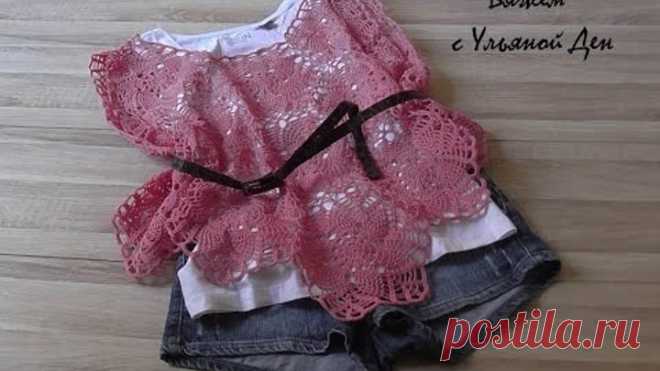 Туника крючком Туника крючком простым узором. Украшает тунику вставка из ажурных узоров паучки.