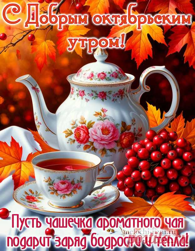 Доброе утро октября открытка красивая с пожеланием: пусть чашка ароматного чая подарит заряд бодрости и тепла