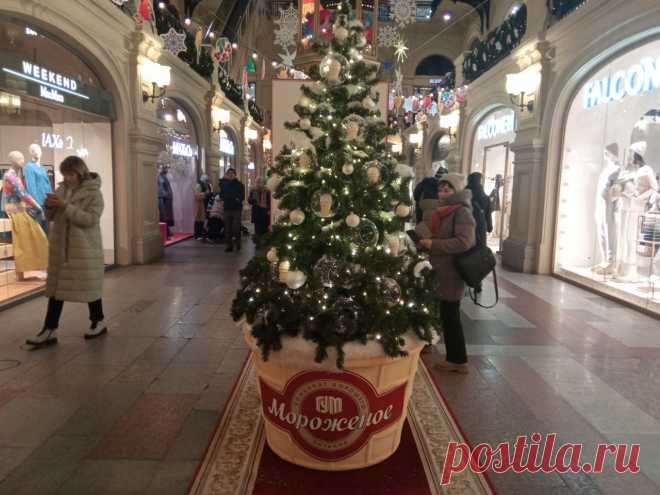 Новогодний ГУМ - прекрасен! Украшены все его три линии, а вместо фонтана - ёлка под потолок. Ёлочные игрушки, традиционные российские промыслы. а также синицы и снегири, снежинки - ГУМ переливается красками и музыкой. Настоящий новогодний квест для тех. кто ещё не купил подарки или просто зашел съесть мороженое.
