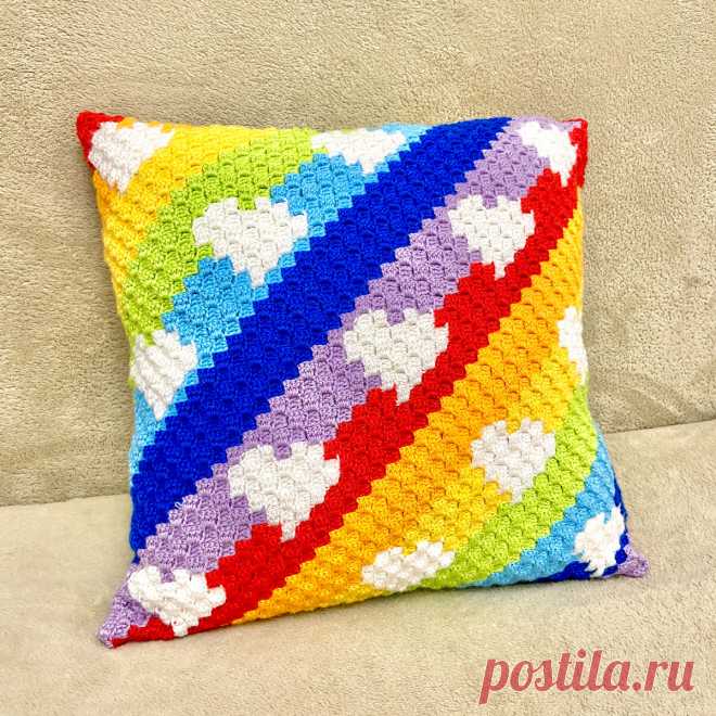 Вязаная подушка с сердечками на радужном фоне в технике вязания крючком С2С. | Повязули. Вязание крючком и вязание С2С. | Яндекс Дзен