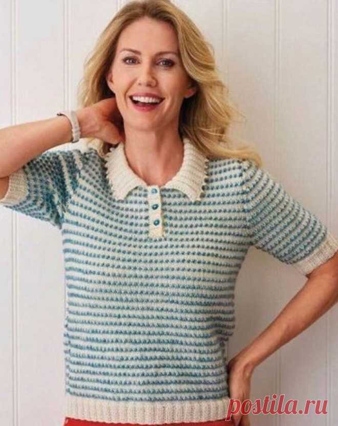 Полосатый пуловер футболка спицами с короткими рукавами «поло» от Sian Brown. Размеры: 8-10 (12-14, 16-18, 20-22, 24-26). Окружность груди – 82-86 (92-97, 102-107, 112-117, 122-127) см. Окружность груди готового изделия – 92 (102, 113, 124, 135) см.
