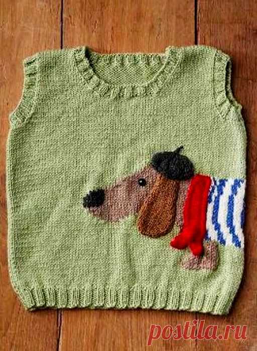Детская безрукавка «Нарядный щенок». Размеры: Для возраста 2-3 года (4-5, 6-7, 8-9) лет. Окружность груди – 53.5 (58.5, 61.5, 66.5) см, Окружность груди готового изделия – 58 (63.5, 67, 72) см.
