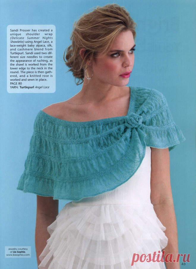 Небольшая шаль для летних вечеров. Размеры готового изделия: окружность верха 81.3см, длина 26.7см.