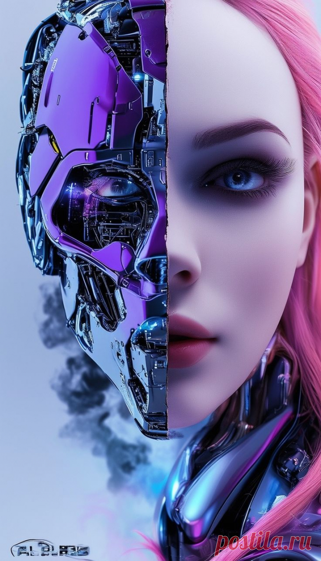 Киберпанк. Девушка - киборг. Голова - киберчереп - лицо 50/50.