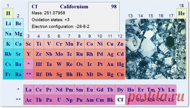 Калифорний — искусственный радиоактивный химический элемент, актиноид, обозначаемый Cf, имеющий атомный номер 98 в периодической системе Менделеева.