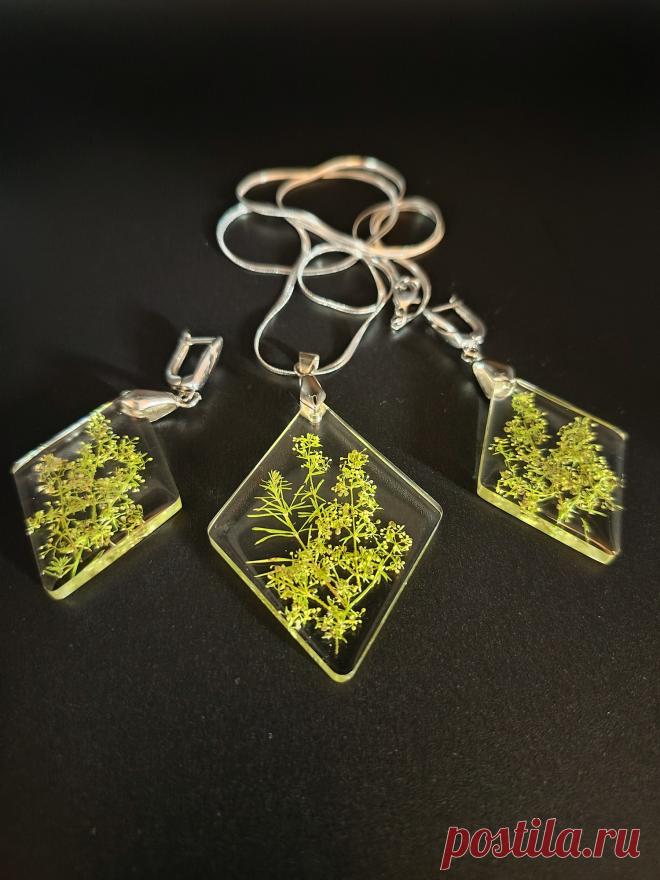 Комплект украшений ручной работы с натуральными растениями. Выполнен из ювелирной смолы.