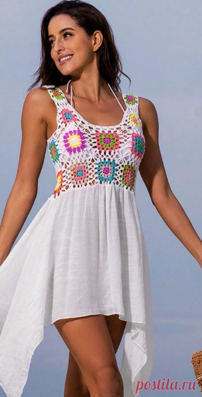 Летнее платье с вязаным лифом из бабушкиных квадратов