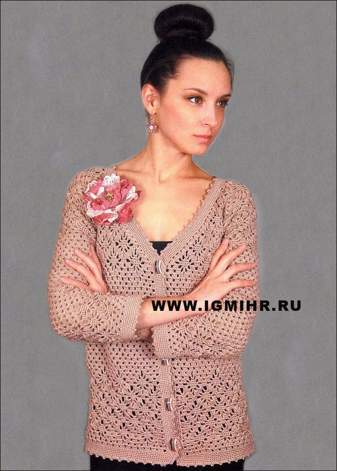 Кардиган цвета чайной розы с ажурными узорами. Крючок