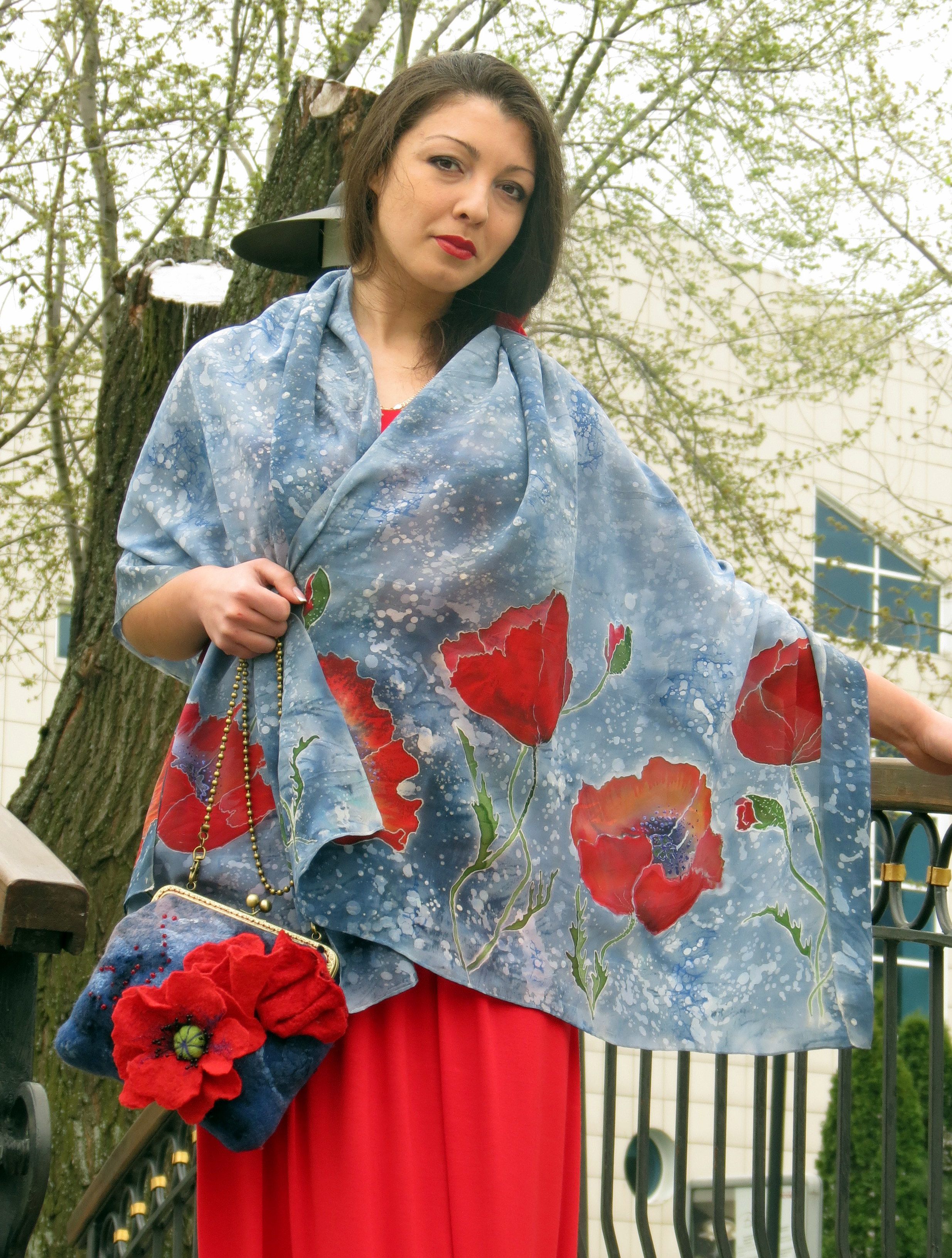 Комплект "Ночные маки" Палантин из натурального шелка расписанный вручную в технике батик, сумочка валяная в технике мокрого валяния (шерсть, натуральные волокна, металлическая фурнитура, подкладочная ткань)