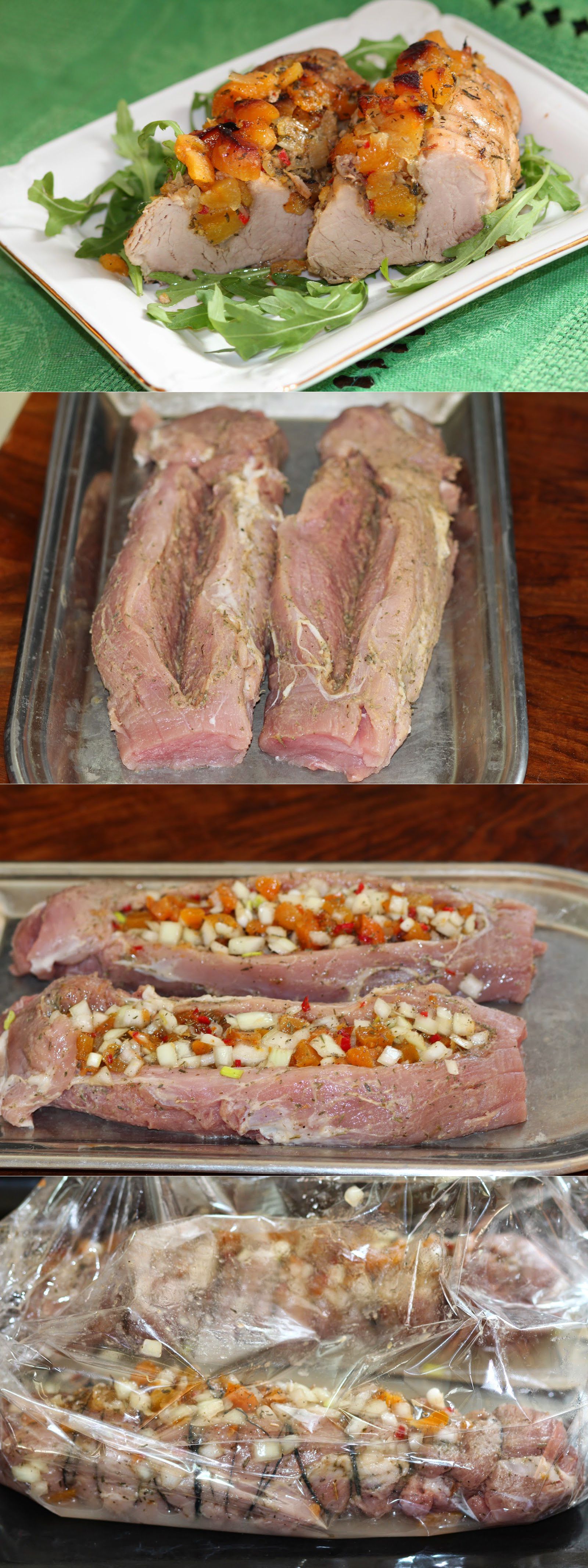Свиная вырезка, фаршированная курагой, луком, острым перцем и кедровыми орешками.