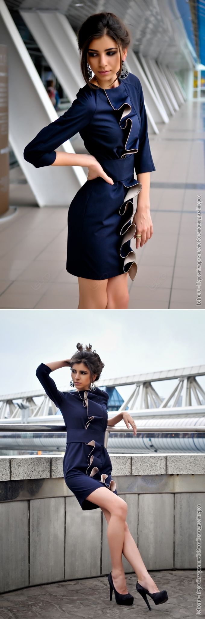 Коктейльное платье от молодого и талантливого дизайнера. Темно-синего цвета, элегантного кроя с "рюшами" - чудесное платье по приятно низкой цене. Купить за 2 500 руб.