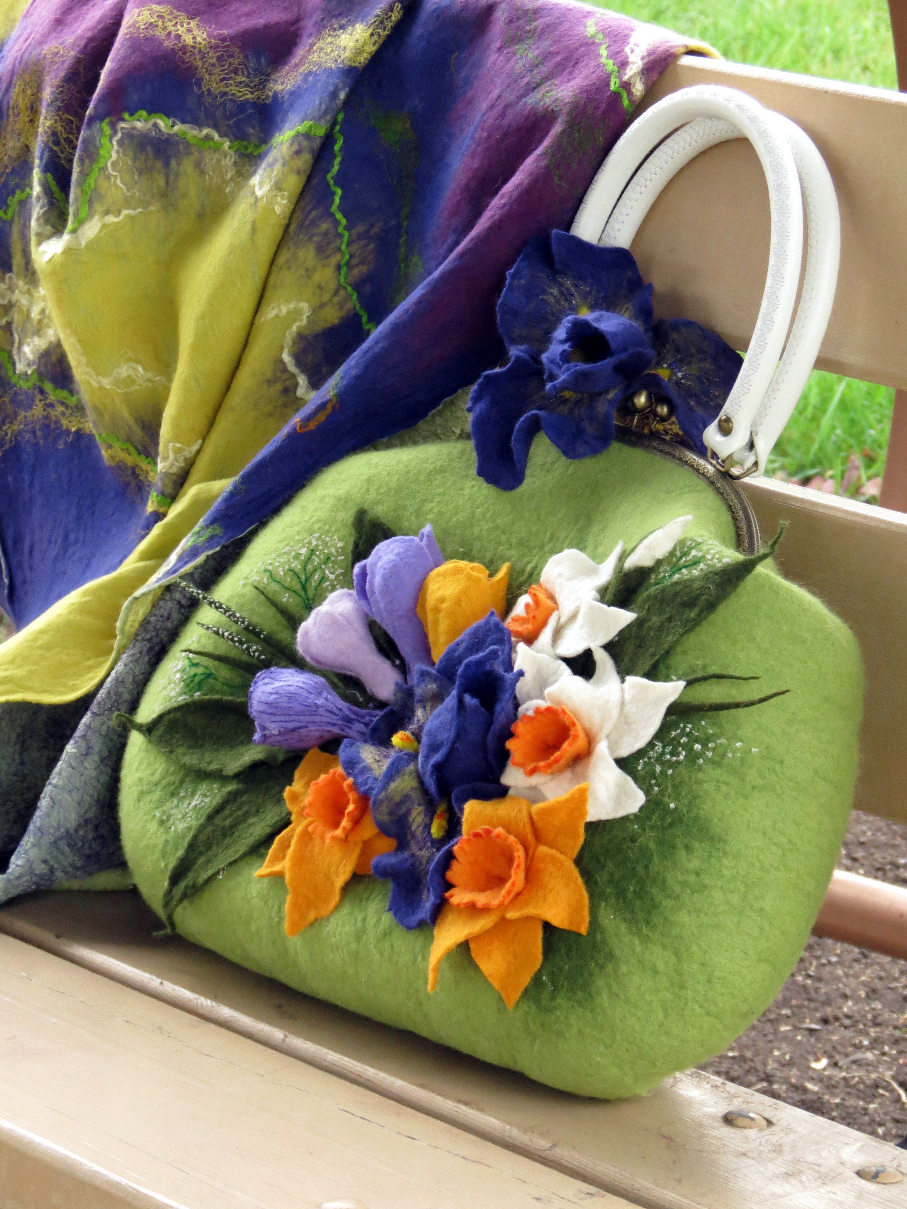 Комплект валяный "Мой весенний сад" Шерсть австралийского мериноса, шелк натуральный понже, Металлическая фурнитра, ручки натуральная кожа.