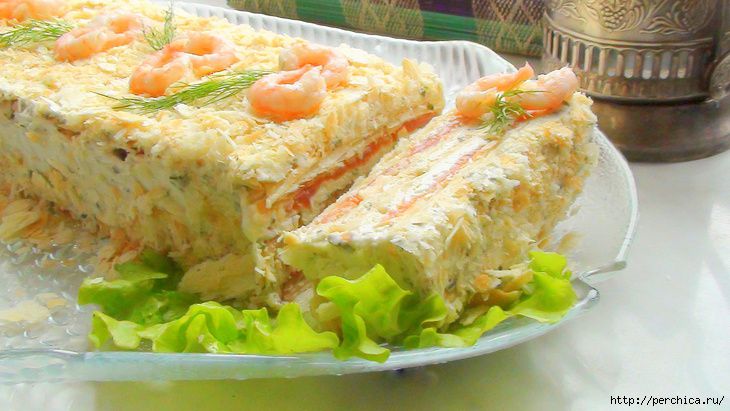 Закусочный торт «Наполеон» с сёмгой, печенью трески и икрой селёдки.