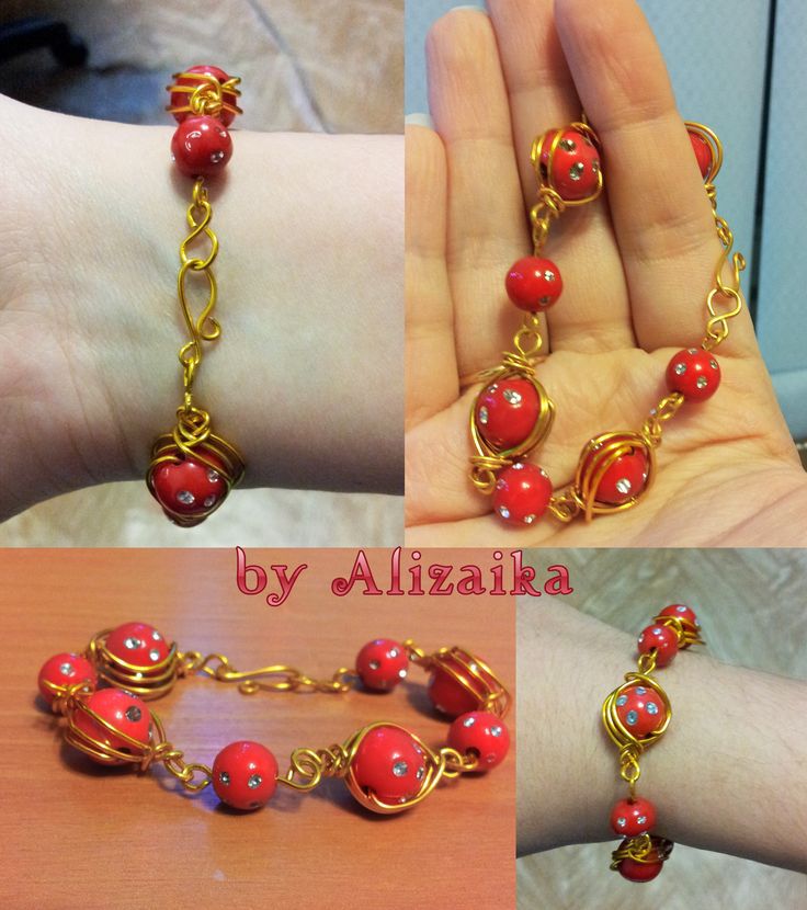 150 р. Браслет Материалы: алюминиевая проволока (1 мм), бусины со стразами Легкий, яркий браслетик с застежкой-крючком. По желанию могу сделать в любых других цветах. Специально для вашей ручки подгоню браслет под нужный размер.