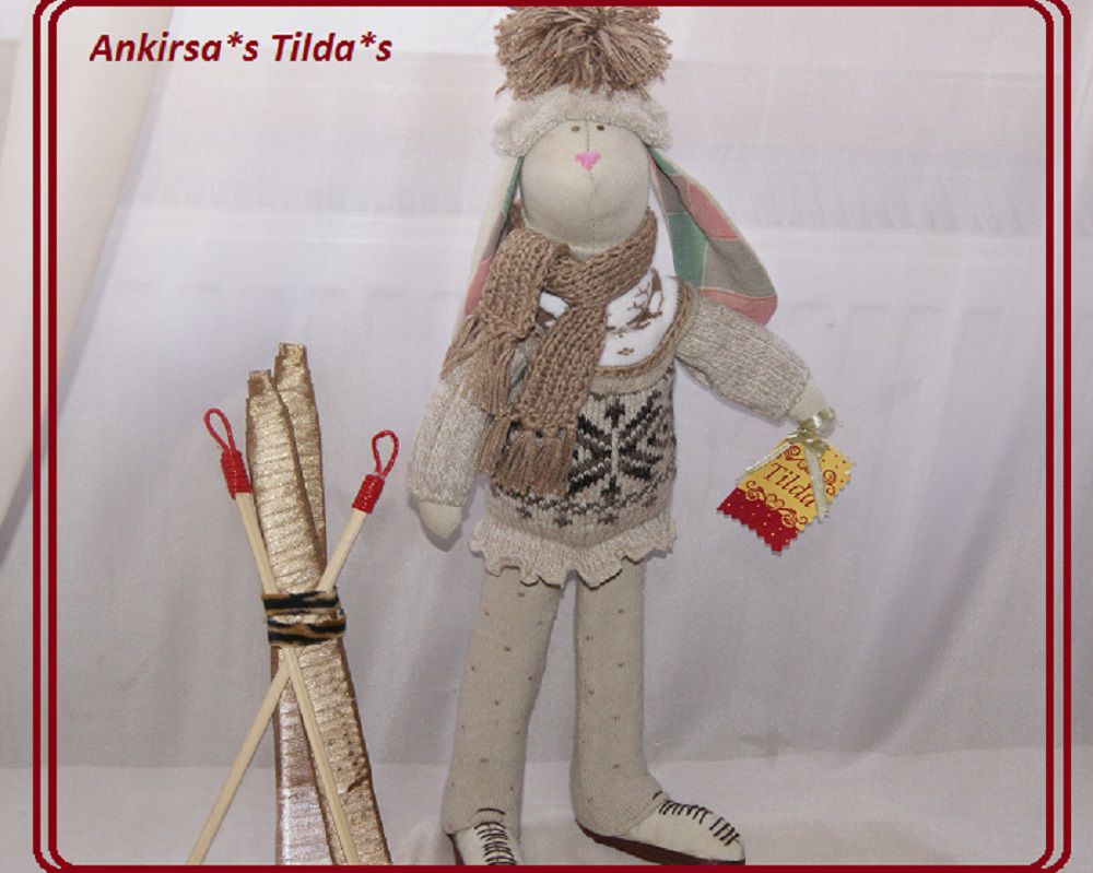 Тильда-Зая лыжница. Шарфик связан и бубон шапочки изготовлен из 100%хлопка.Зая имеет рост 40 см.