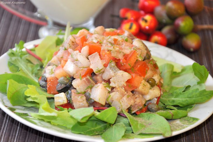 - Филе порезать кубиками (у меня - 2 шт). Чеснок порубить мелко (я терла на терке). Лук мелко порезать (у меня репчатый, резала мелким кубиком). Зелень мелко порубить (у меня укроп). Острый перец мелко порезать (я убирала семечки, Серж - нет). Помидор порезать кубиками (у меня 2 шт). Соединить все ингредиенты, добавить каперсы (я добавляла чайную ложку с горкой, вместе с маринадом, который попал в ложку), соль, перец, лимонный сок, оливковое масло, красную икру (у меня икры не было, я добавила немного оливок). Если добавляете икру, то немножко оставить для подачи. Все перемешать. Травки (у меня микс, на порцию - хорошая такая, большая горсть) выложить на тарелку, сверху выложить салат, украсить икрой, присыпать молотым перцем, полить зелень оставшейся заправкой (на дне миски немного остается, после перемешивания). Приятного аппетита.