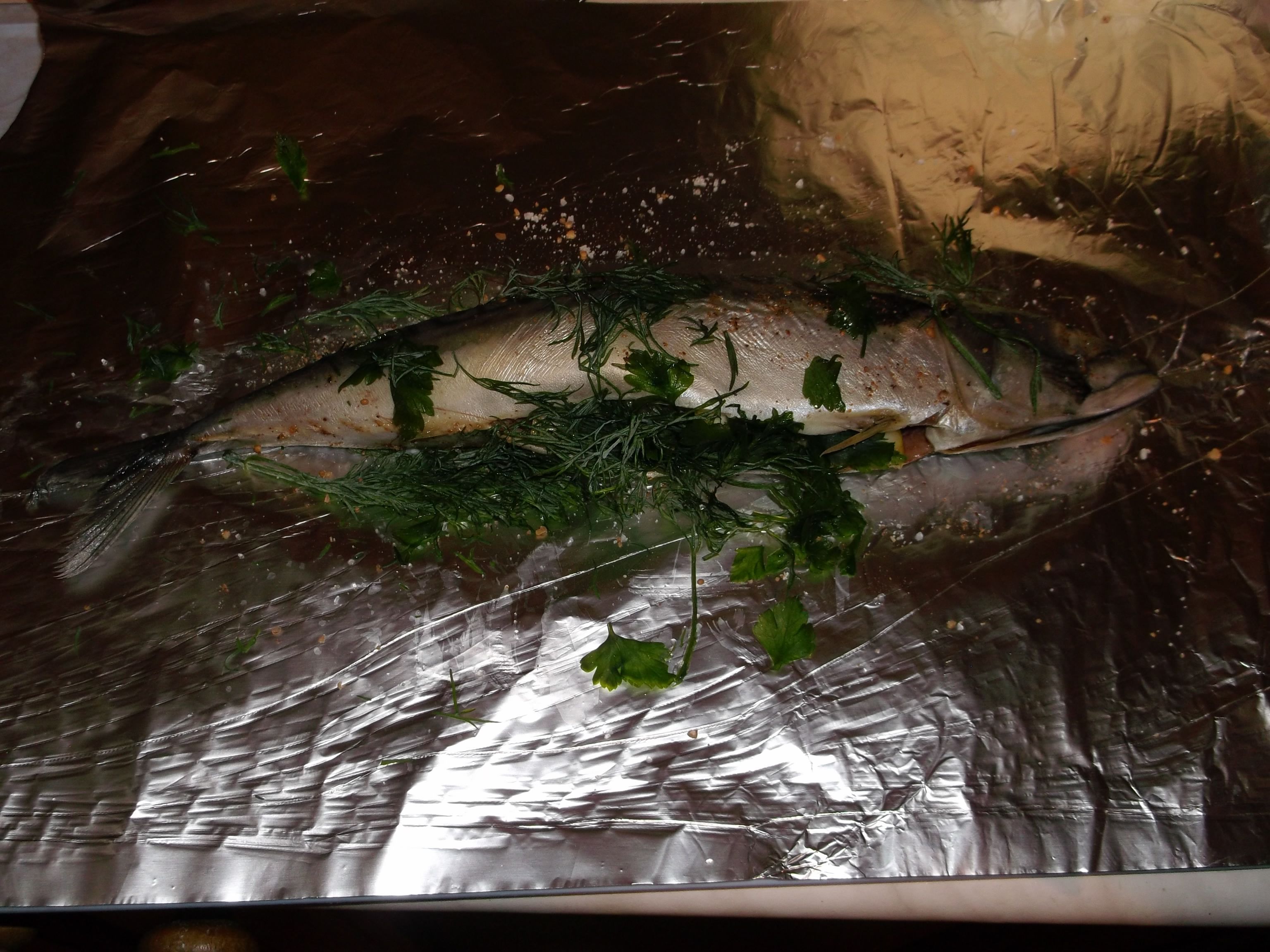 Почистить рыбу. Натереть брюшко и снаружи перцем и солью. Набить брюшко мелко нарезанным лимоном, укропом,петрушкой.